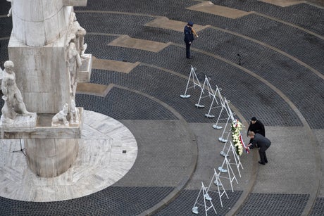 The Dutch king laid a wreath Tuesday at a monument to the country's war dead at a solemn commemoration ceremony devoid of the usual huge crowds for the second straight year because of coronavirus lockdown measures.