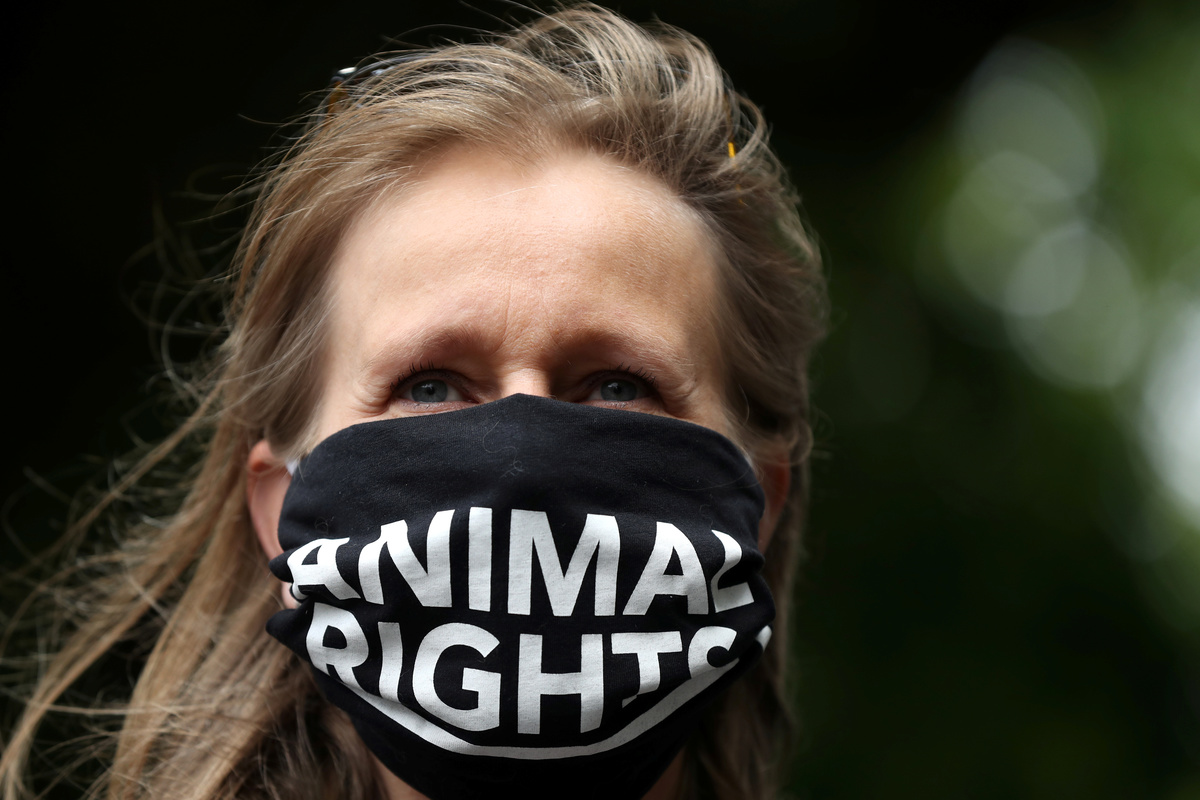 A demonstrator wearing a protective face mask attends a protest calling for an end to the fur trade, following the decision of the Dutch government to cull thousands of mink on farms where animals are infected with the coronavirus disease (COVID-19), in The Hague, Netherlands, June 8, 2020. REUTERS/Eva Plevier