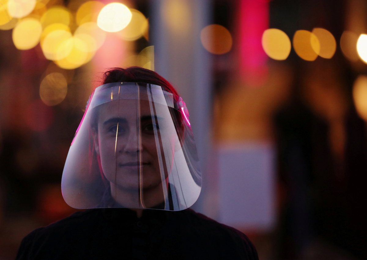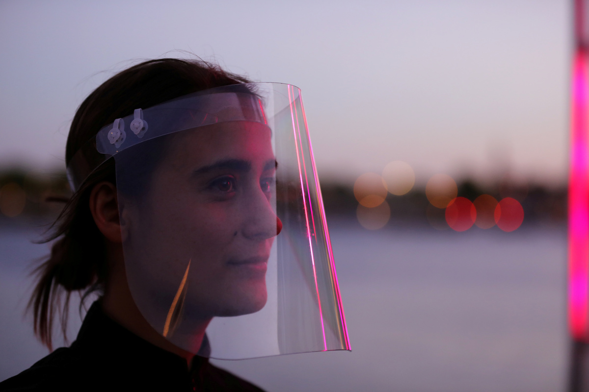 A waitress poses for a picture with protective gear at a restaurant where they test waiters serving drinks and food to models pretending to be clients in a safe "quarantine greenhouses" in which guests can dine in Amsterdam, Netherlands May 5, 2020. Picture taken May 5, 2020. REUTERS/Eva Plevier