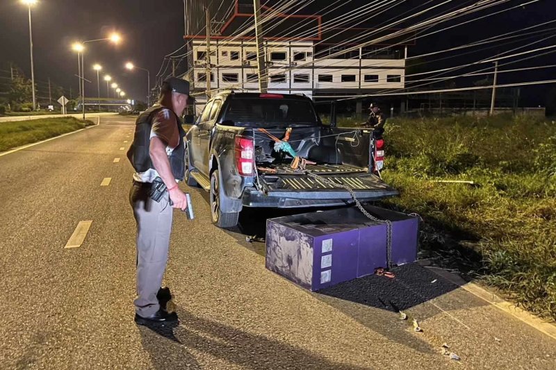 An ATM of Siam Commercial Bank was tied up with big chains that were attached to the truck. The ATM was apparently dragged from a shop for about 20 metres.