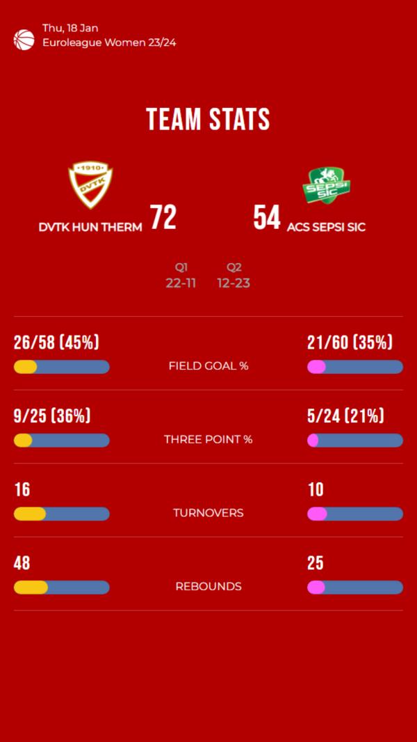 In an exhilarating showdown of basketball prowess, DVTK Hun Therm emerged victorious over ACS Sepsi SIC with a final score of 72-54 in the Euroleague Women 23/24. The match showcased an impressive display of skill, strategy, and determination, with DVTK Hun Therm prevailing as the superior team.
