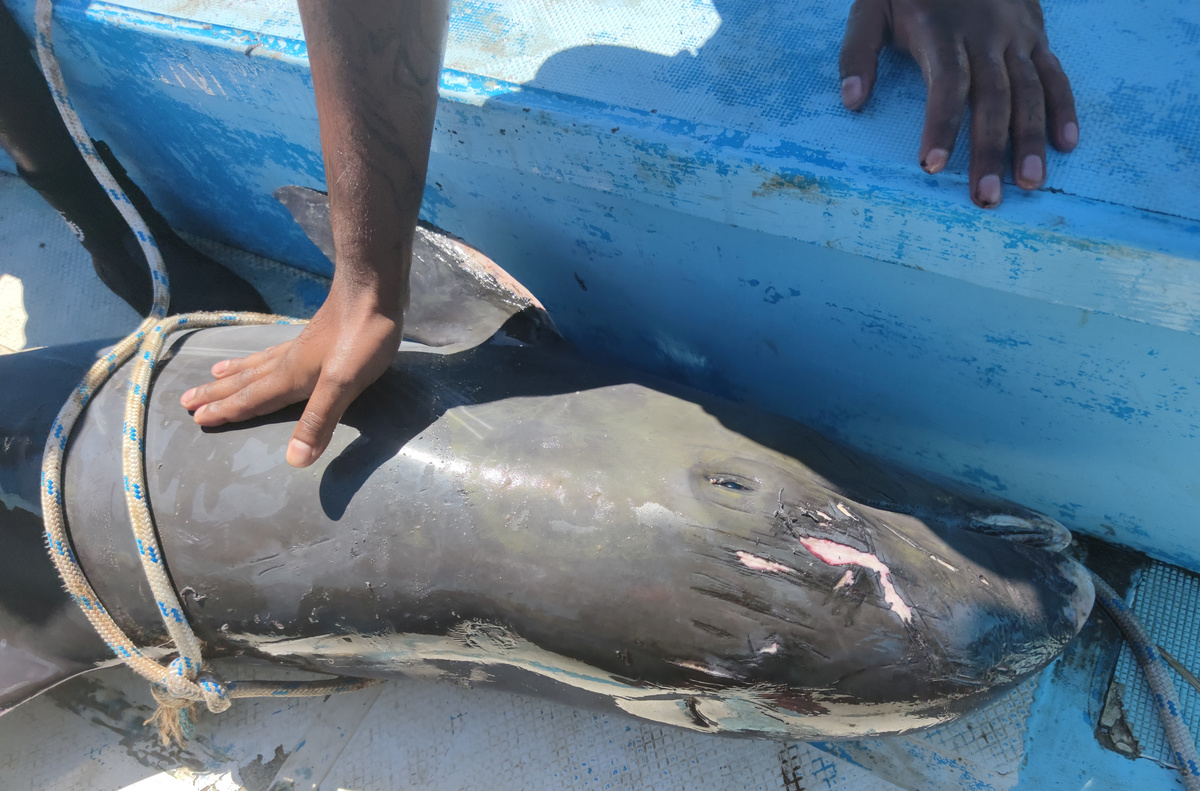"Some were injured and some were just floating," Heenaye said. Fishermen were trying to herd the dolphins out of the lagoon into the open seas.