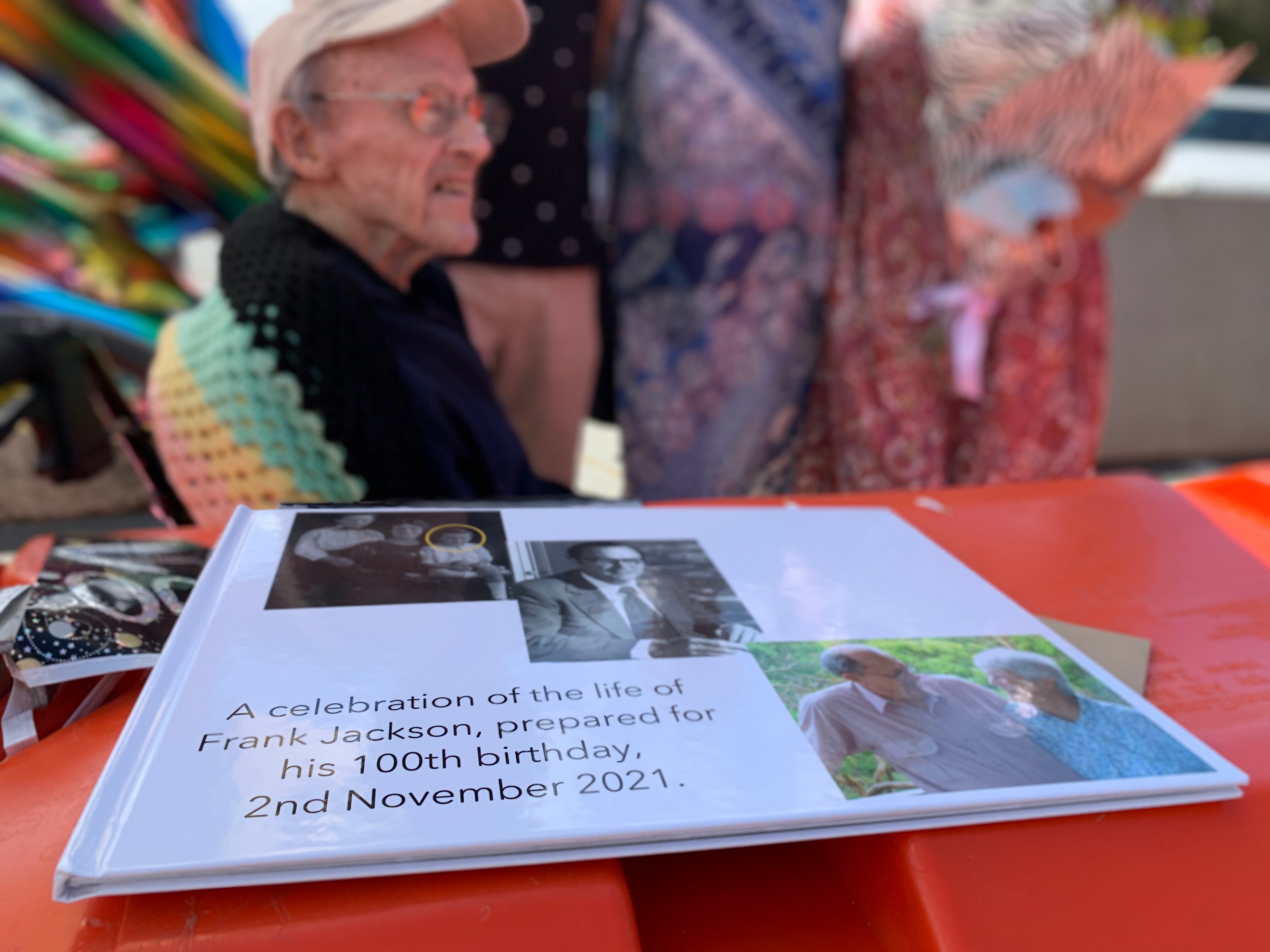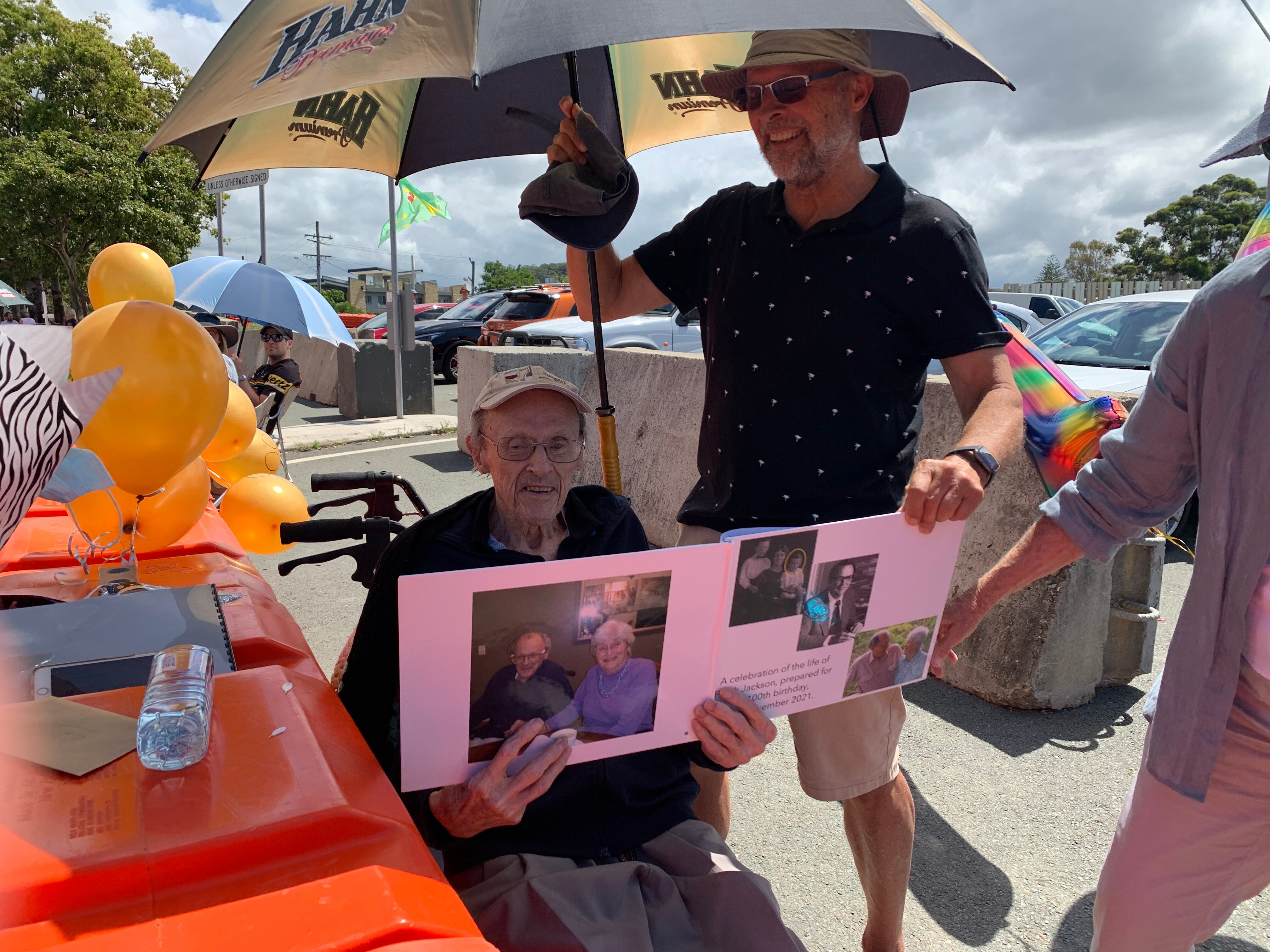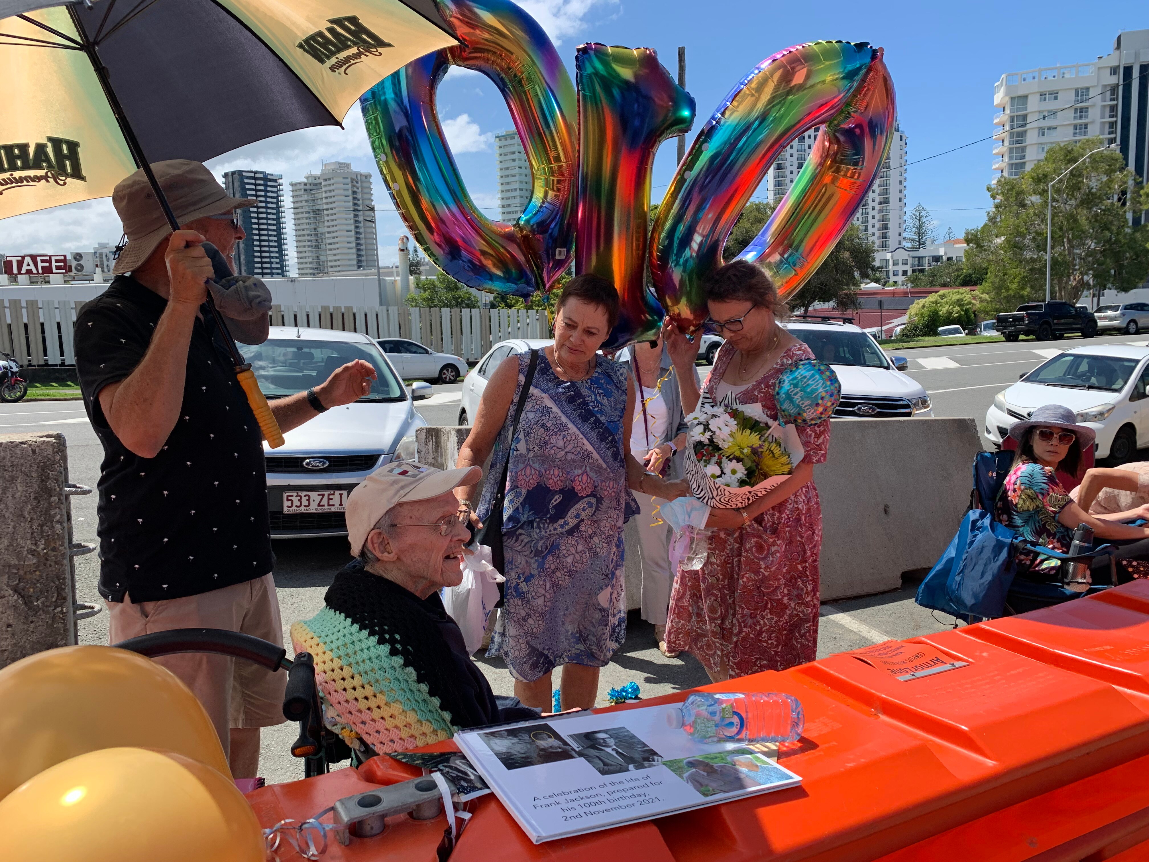 Under the shade of an umbrella, with a crocheted blanket draped over his shoulders, war veteran Frank Jackson celebrated a major milestone, surrounded by family.