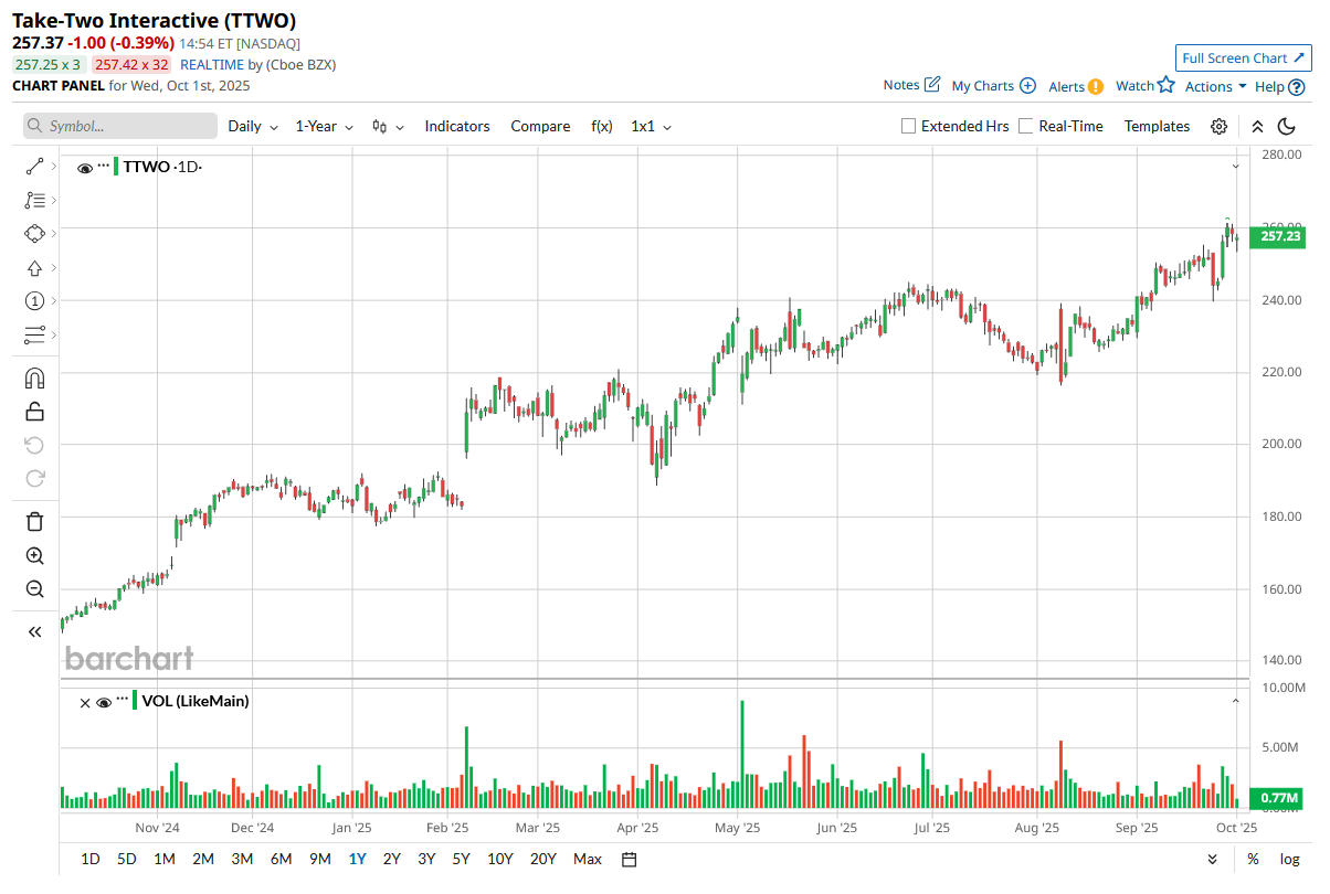 TTWO stock’s performance backs that up. Over the past 52 weeks, shares are up 70%, and year-to-date (YTD) they’re up about 40%, showing strong confidence in execution and what’s ahead.