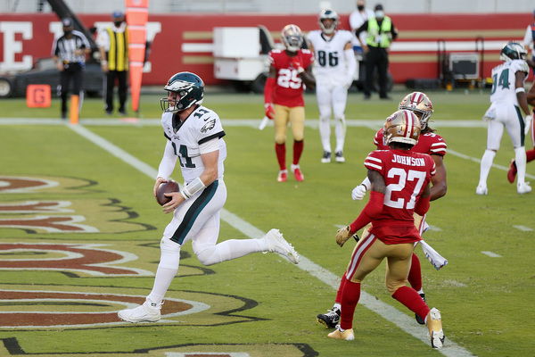 "I don't recall necessarily a conversation about it. I think it's been a part of who Carson is," Pederson said. "We've encouraged him to use his legs, especially on passing situations when things break down. He's really good at it. He breaks tackles. He gets out of it. He's extended plays, and he's been successful. We still have to be smart in the run game and some of the things that we do with him. But it's a little bit of a conscious effort to get him more involved in the run game as a runner because he is big, strong, and powerful. Why not utilize that when we can?"