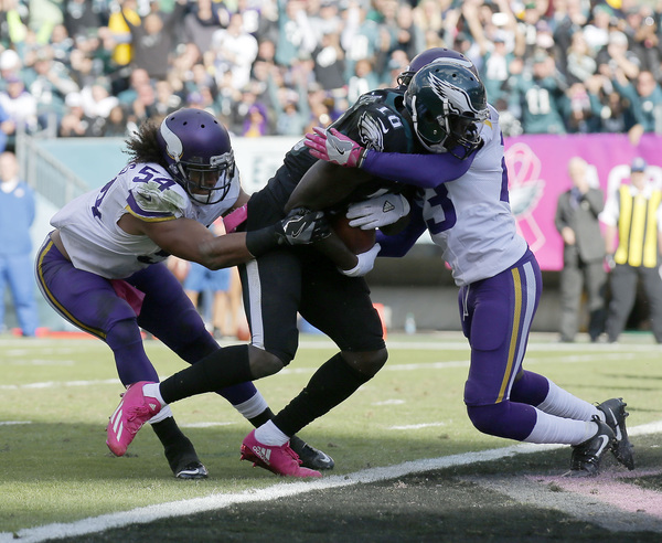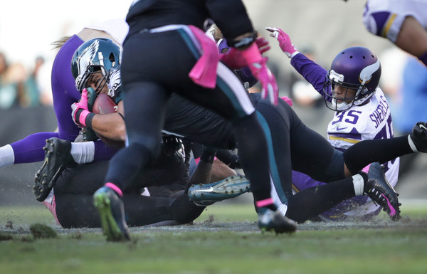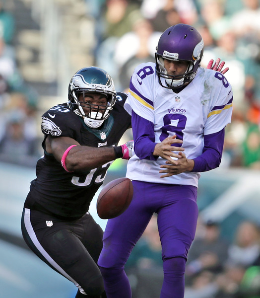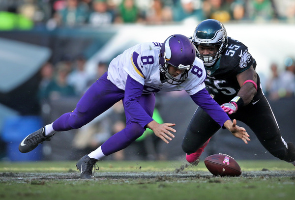 The Eagles forced four turnovers against a team that had not committed an offensive turnover all season. They limited the Vikings to 282 yards on 74 plays, a measly 3.8 yards per snap. Bradford was sacked six times, hit 12 times, and fumbled four times, with the Eagles recovering two of them.