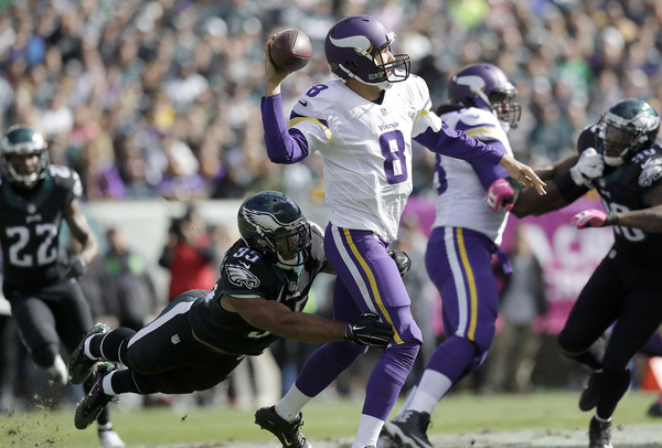 Bradford finished 24 of 41 for 224 yards with one touchdown and one interception, but it was the Eagles' pressure on him that was most impressive. The defenders overpowered an outmatched Vikings line, whether it was the four-man pass rush or with considerably more blitzing than usual for a Jim Schwartz defense.
