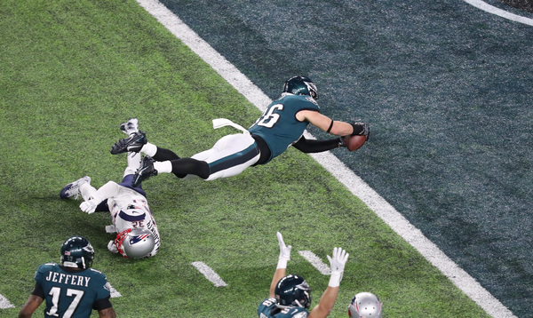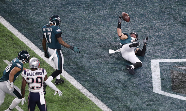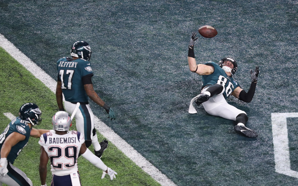Jason Kelce snapped the ball to running back Corey Clement, who pitched it to Trey Burton, who threw the pass to a wide-open ... Foles. Yes, Foles caught a touchdown. Brady dropped a catch earlier in the game on a Patriots trick play. Foles showed he has the better hands, catching the 1-yard score to give the Eagles a 22-12 lead in halftime. The Eagles did not call that play all season, and Pederson put it in the game plan to call in one of the biggest moments on the biggest stage.