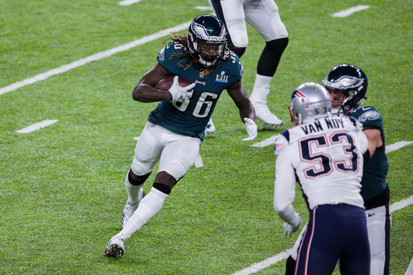 If the Eagles' first drive was methodical, their second drive relied on a quick-strike, "chunk" plays. LeGarrette Blount rushed for a 36-yard gain up the middle against his former team, setting up one of the highlight-reel plays of the game. Foles faked the handoff and passed it deep to the left corner of the end zone to Alshon Jeffery, who hauled in an acrobatic catch over former Eagle Eric Rowe.