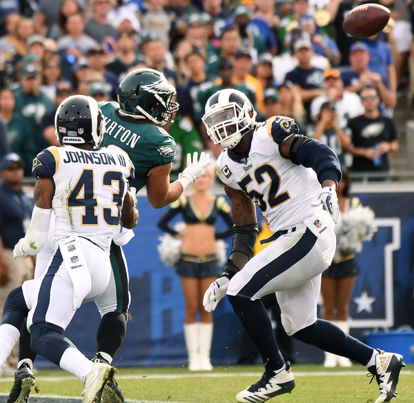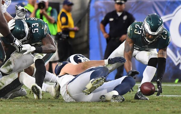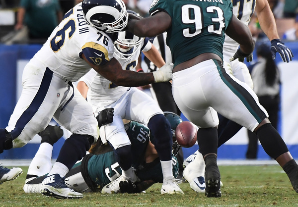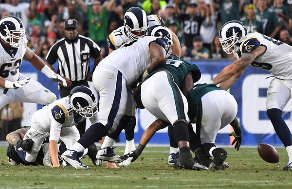 And then Jim Schwartz's defense rebounded from its worst game yet this year with a critical stop. Chris Long sacked Rams quarterback Jared Goff on a first down at the Rams' 35-yard line and knocked the ball out of Goff's grasp. Rodney McLeod scooped the fumble and brought it to the 25-yard line to give the Eagles a chance to take the lead. Elliott's 33-yard field goal put the Eagles on top, and the defense came through with a key stop to allow the Eagles to run out the clock. Foles found Nelson Agholor for a clutch third-down catch to help seal the win. The defense scored a touchdown on the final play to give them the nine-point lead.