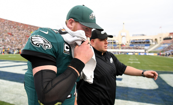 Wentz was in the third quarter of perhaps his finest game with the Eagles when he tried rushing for a touchdown and took a big hit while diving for points. A penalty flag nullified the play, and Wentz's gait appeared abnormal or the remaining four plays. He couldn't move like he normally does, and even though he remained in the game to throw a clutch a fourth-down touchdown pass to Alshon Jeffery, he did not celebrate as he normally does. Wentz walked gingerly to the sideline, where he was greeted by the medical staff. They quickly evaluated him in a makeshift blue tent, and then brought him into the locker room. It was quickly determined that he would not return to the game.