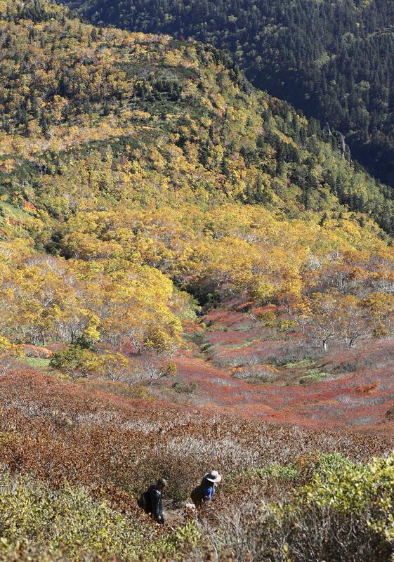 Hikers walk amid fall foliage on Mt. Kurodake in Hokkaido on Monday. The 1,984-meter peak in the Daisetsuzan mountain range is one of the first places in the country where leaves begin changing color. A local ropeway operator said trees near the summit began turning red and gold in late August, similar to an average year. However, significant differences between day and night temperatures this year mean the colors are more vibrant than usual, a company representative said. The autumn hues are spreading down the mountain to Sounkyo Onsen hot spring resort located at the foot of Mt. Kurodake and can be enjoyed until early October.