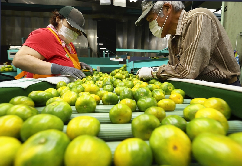 Shipment of an ultra-early-ripening tangerine varietal called the Gokuwase Mikan has reached its peak in Numazu, Shizuoka Prefecture. Workers have been busy sorting the fruit by hand and machine for packing into boxes one after another at the JA Nansun Nishiura citrus sorting station.