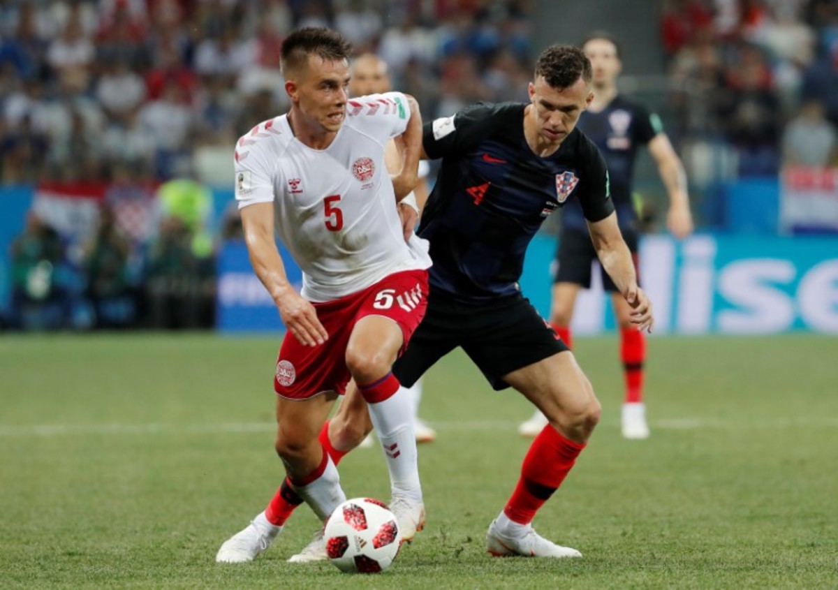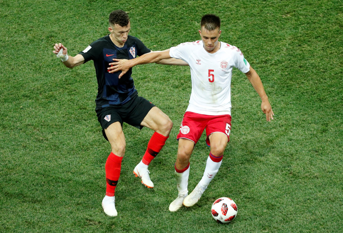 Soccer Football - World Cup - Round of 16 - Croatia vs Denmark - Nizhny Novgorod Stadium, Nizhny Novgorod, Russia - July 1, 2018 Denmark's Jonas Knudsen in action with Croatia's Ivan Perisic REUTERS/Carlos Barria