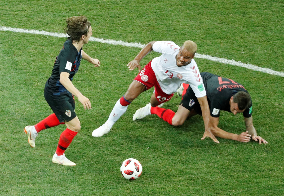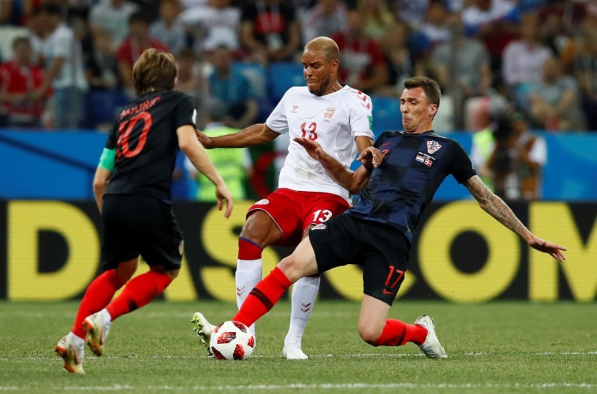 Soccer Football - World Cup - Round of 16 - Croatia vs Denmark - Nizhny Novgorod Stadium, Nizhny Novgorod, Russia - July 1, 2018 Denmark's Mathias Jorgensen in action with Croatia's Mario Mandzukic REUTERS/Jason CairnduffSoccer Football - World Cup - Round of 16 - Croatia vs Denmark - Nizhny Novgorod Stadium, Nizhny Novgorod, Russia - July 1, 2018 Croatia's Luka Modric and Mario Mandzukic in action with Denmark's Mathias Jorgensen REUTERS/Max Rossi