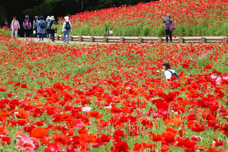 A field of shirley poppies is seen Wednesday at Showa Kinen Park, which straddles the border between Tachikawa and Akishima cities in Tokyo. About 1.8 million red and pink poppies grow on Flower Hill and can be viewed until later this month. Visitors can pick the flowers on May 26.