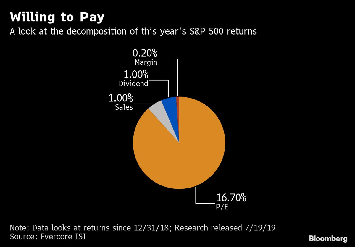 Evercore ISI estimates that as of Friday, 16.7 percentage points of the market’s 18% return was the result of multiple expansion -- investors paying more for the same earnings -- with the 12-month forward price-earnings ratio rising from 14 in January to 17 now. Growth in sales, dividends, and margins have each contributed less than 1%.