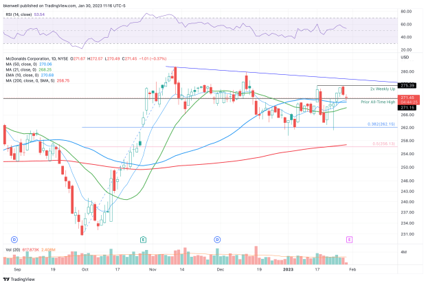 On a negative reaction, the first main level to watch is $267, which is about 1.5% below current levels. A break of this level puts McDonald’s below its 10-day, 21-day and 50-day moving averages.