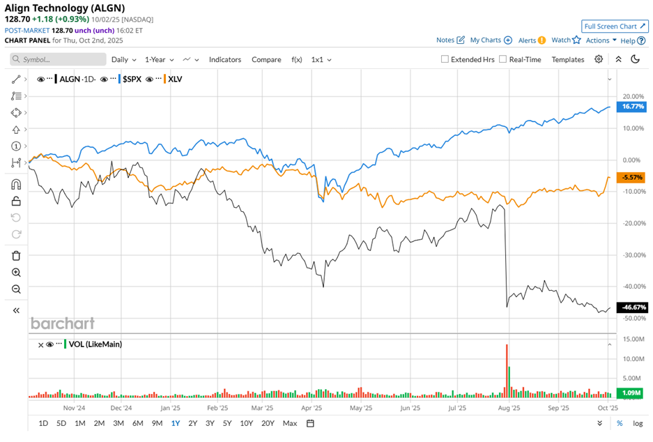 Shares of Align Technology have underperformed relative to the broader market. Over the past 52 weeks, the stock has declined 45.9%, and year-to-date (YTD), it is down 38.3%. Meanwhile, the S&P 500 Index ($SPX) gained 17.6% over the past year and 14.2% in 2025.