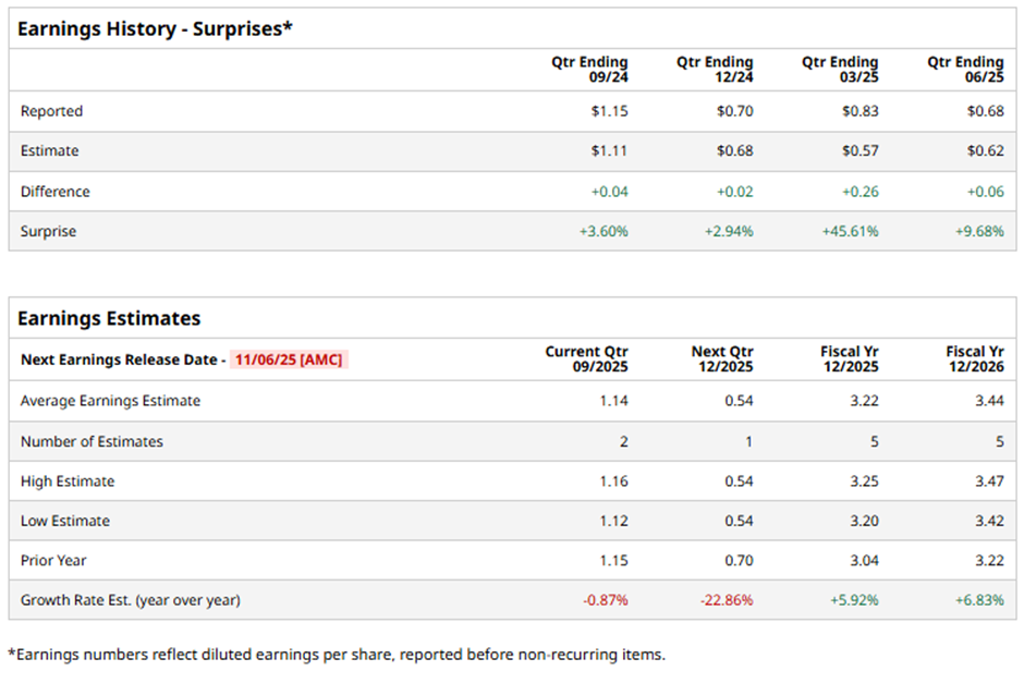 The Madison, Wisconsin-based company is expected to unveil its fiscal Q3 2025 results after the market closes on Thursday, Nov. 6. Before the event, analysts anticipate Alliant Energy to report an adjusted EPS of $1.14, down marginally from $1.15 in the year-ago quarter. However, it has surpassed Wall Street's bottom-line estimates in the past four quarters.