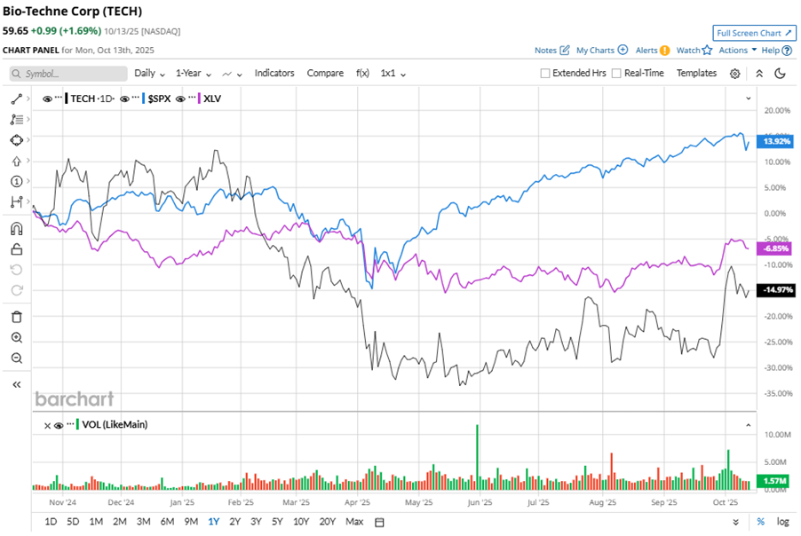 TECH stock has significantly underperformed the S&P 500 Index’s ($SPX) 14.4% gains over the past 52 weeks, with shares down 18.7% during this period. Similarly, it underperformed the Health Care Select Sector SPDR Fund’s (XLV) 7.8% losses over the same time frame.