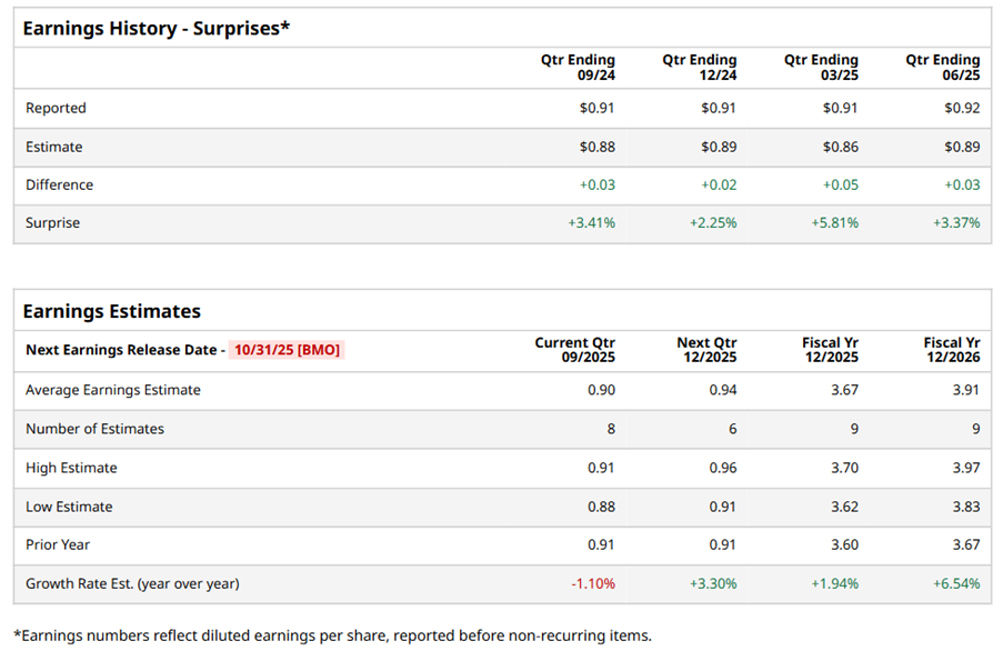 New York-based Colgate-Palmolive Company (CL) manufactures and sells consumer products. With a market cap of $63.4 billion, the company’s products include toothpaste, toothbrushes, shampoos, deodorants, bar and liquid soaps, dishwashing liquid, and laundry products, as well as pet nutrition products for cats and dogs. The global leader in toothpaste is expected to announce its fiscal third-quarter earnings for 2025 before the market opens on Friday, Oct. 31.