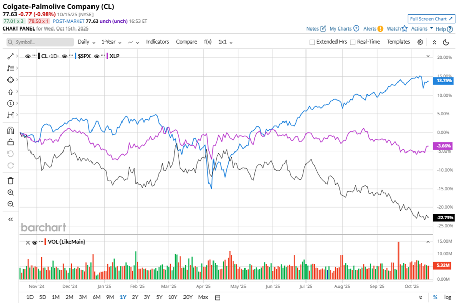 CL stock has significantly underperformed the S&P 500 Index’s ($SPX) 14.7% gains over the past 52 weeks, with shares down 23.6% during this period. Similarly, it considerably underperformed the Consumer Staples Select Sector SPDR Fund’s (XLP) 4% losses over the same time frame.