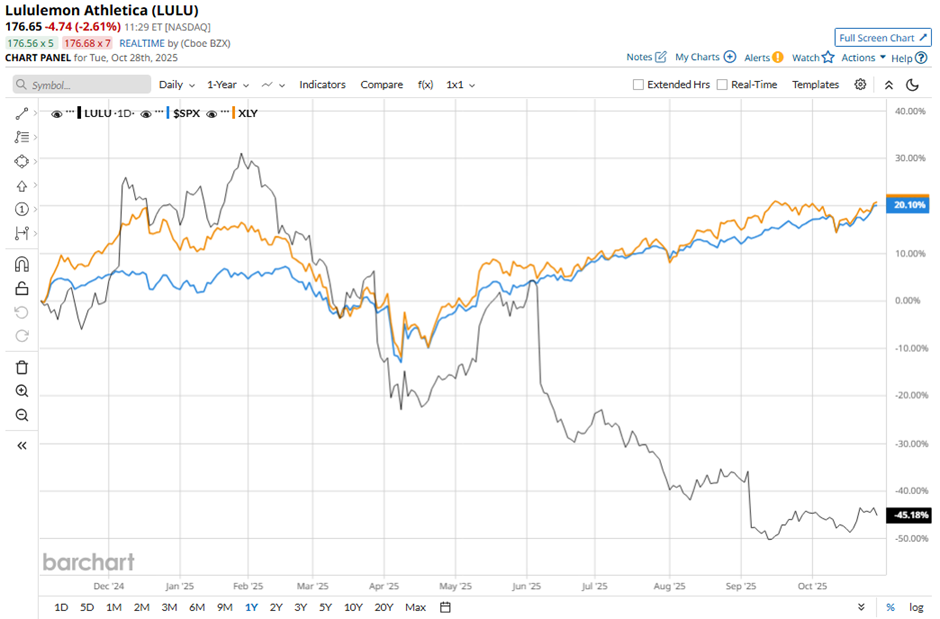 Shares of lululemon athletica have tumbled 42.5% over the past 52 weeks, underperforming both the S&P 500 Index's ($SPX) 18.1% return and the Consumer Discretionary Select Sector SPDR Fund's (XLY) 19.9% increase over the period.