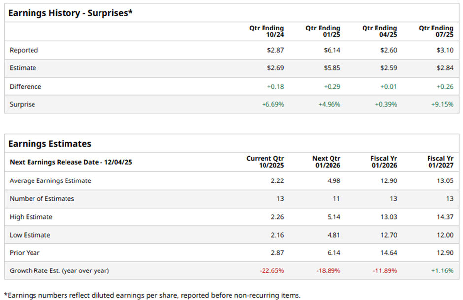 The Vancouver, Canada-based company is set to announce its fiscal Q3 2025 results soon. Ahead of this event, analysts expect lululemon athletica to report an EPS of $2.22, down 22.7% from $2.87 in the year-ago quarter. However, it has surpassed Wall Street's earnings estimates in the last four quarters.