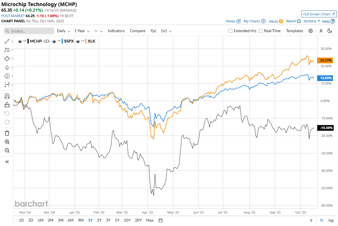 MCHP stock has declined 13.9% over the past 52 weeks, underperforming the Technology Select Sector SPDR Fund’s (XLK) 24% surge and the S&P 500 Index’s ($SPX) 13.5% uptick during the same time frame.
