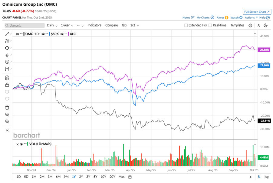 OMC stock has considerably underperformed the S&P 500 Index’s ($SPX) 17.6% gains over the past 52 weeks, with shares down 24.7% during this period. Similarly, it considerably lagged behind the Communication Services Select Sector SPDR ETF’s (XLC) 29.1% gains over the same time frame.
