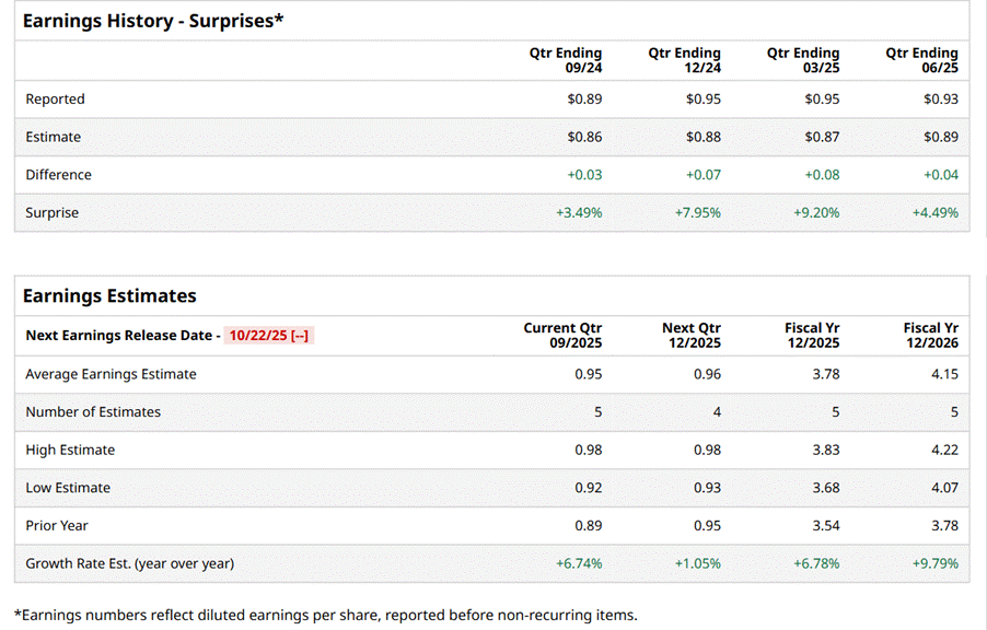 Valued at a market cap of $26.3 billion, Veralto Corporation (VLTO) provides water analytics, water treatment, marking and coding, and packaging and color solutions. The Waltham, Massachusetts-based company focuses on essential technologies that safeguard water and product quality. It is scheduled to announce its fiscal Q3 earnings for 2025 on Wednesday, Oct. 22.