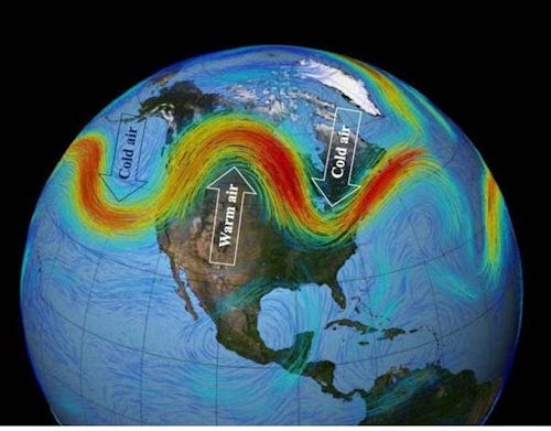 This allows north-moving warm air to cross the polar boundary, and cold fronts emanating from the poles to intrude south into Siberia, Europe and Canada.