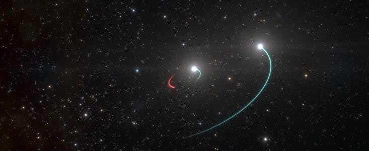 The follow-up observations revealed two bright sources separated by only one-third of the distance between the Earth and the Sun, meaning there was no black hole in the middle. Instead, the system was made up of two stars on a 40-day orbit, with one of the stars having been stripped of its material by its companion star.
