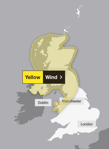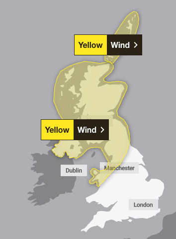 The warnings for wind are in place across Scotland, Northern Ireland and the north of England on Saturday and Sunday, with peak gusts of 80 to 90mph possible in certain exposed areas.