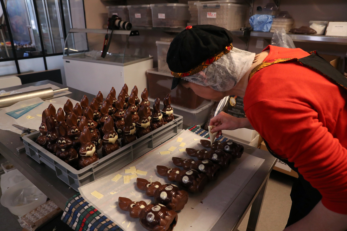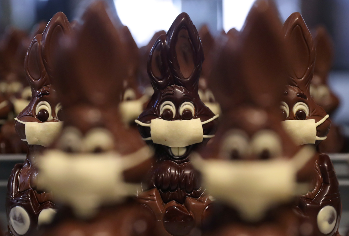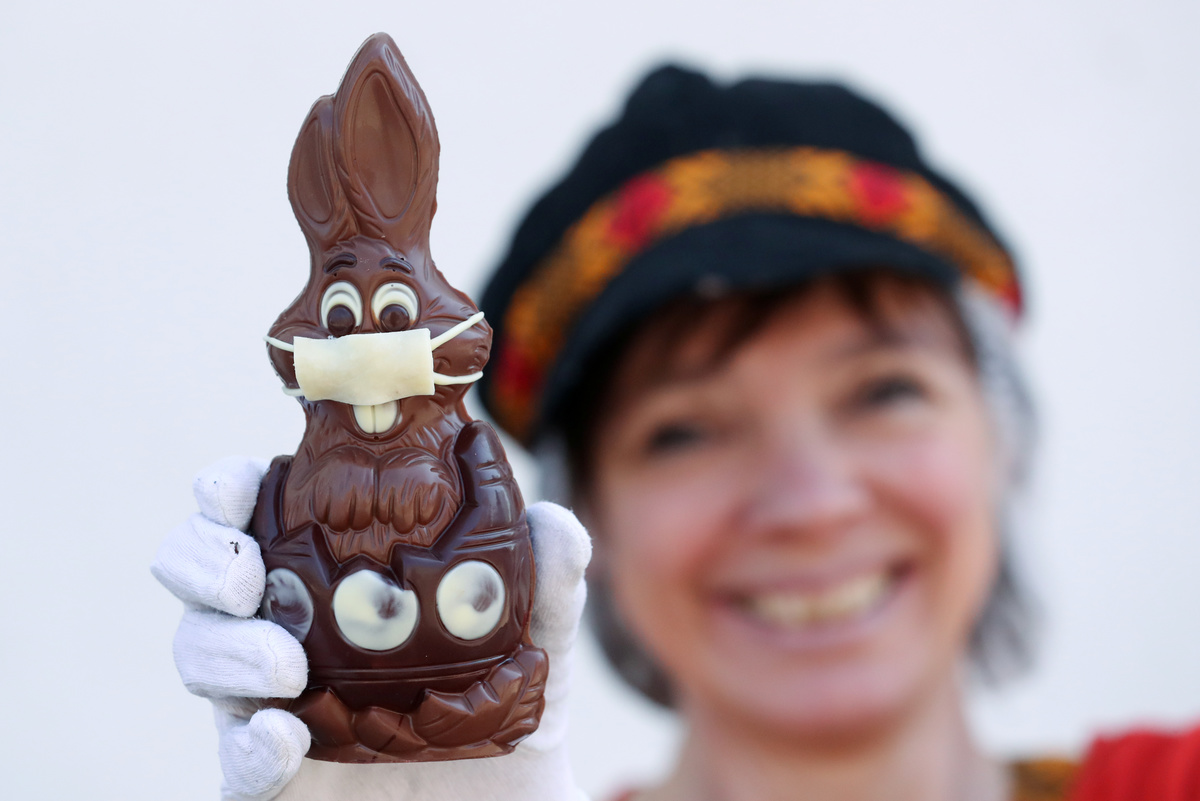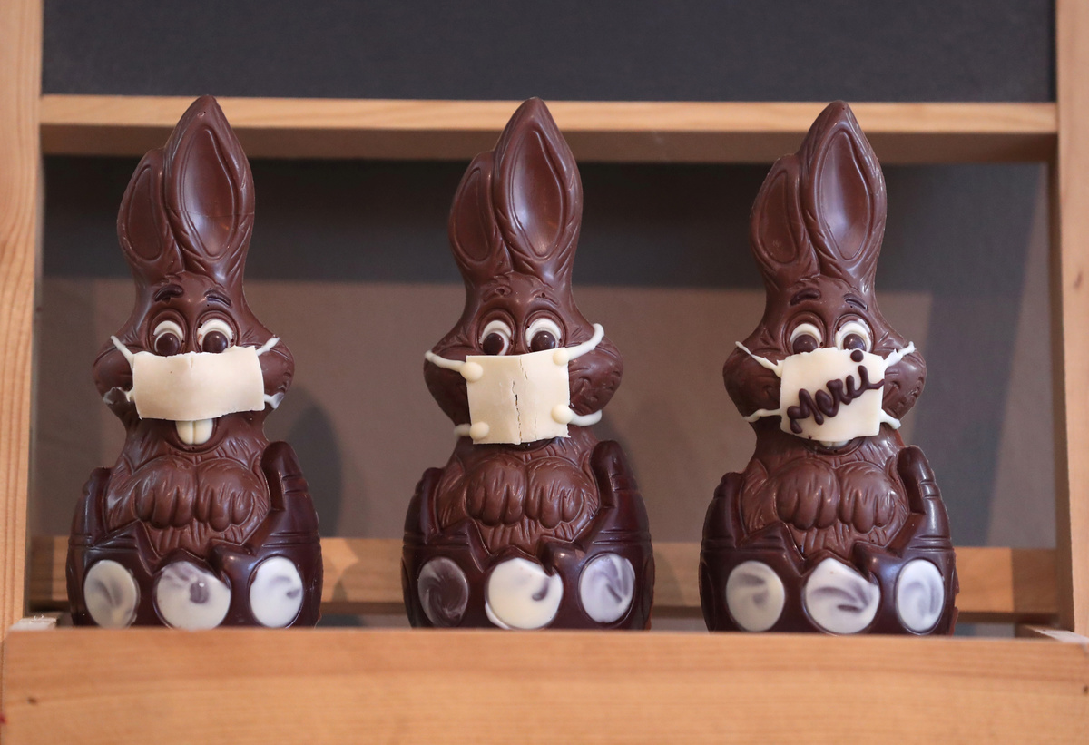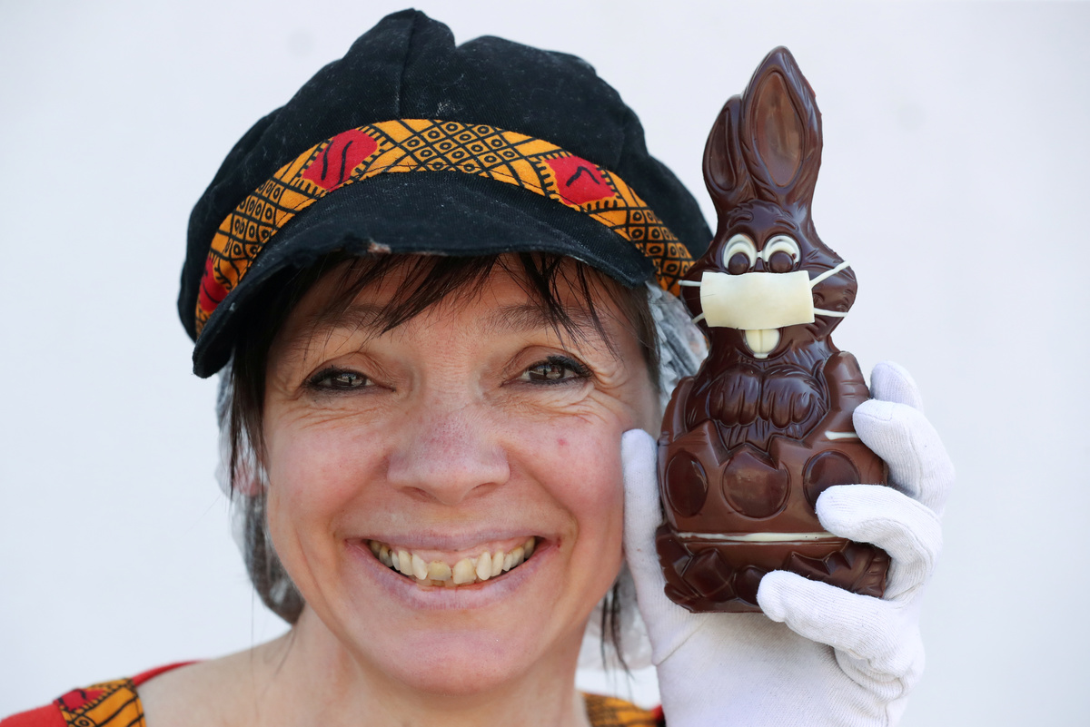 Belgian artisan chocolate maker Genevieve Trepant poses with chocolate Easter bunnies wearing protective masks at her workshop, during the coronavirus disease (COVID-19) outbreak in Lonzee, Belgium April 10, 2020. REUTERS/Yves HermanBelgian artisan chocolate maker Genevieve Trepant works on chocolate Easter bunnies at her workshop, during the coronavirus disease (COVID-19) outbreak in Lonzee, Belgium April 10, 2020. REUTERS/Yves HermanChocolate Easter bunnies wearing protective masks are seen in the workshop of Belgian artisan chocolate maker Genevieve Trepant, during the coronavirus disease (COVID-19) outbreak in Lonzee, Belgium April 10, 2020. REUTERS/Yves Herman