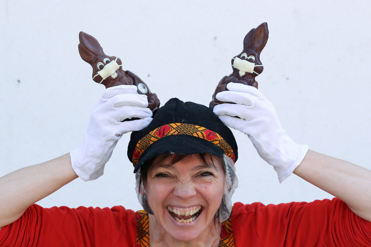 Belgian artisan chocolate maker Genevieve Trepant approached this Easter with a topical note, adding face masks to the bunnies she makes in fairtrade milk or dark chocolate.