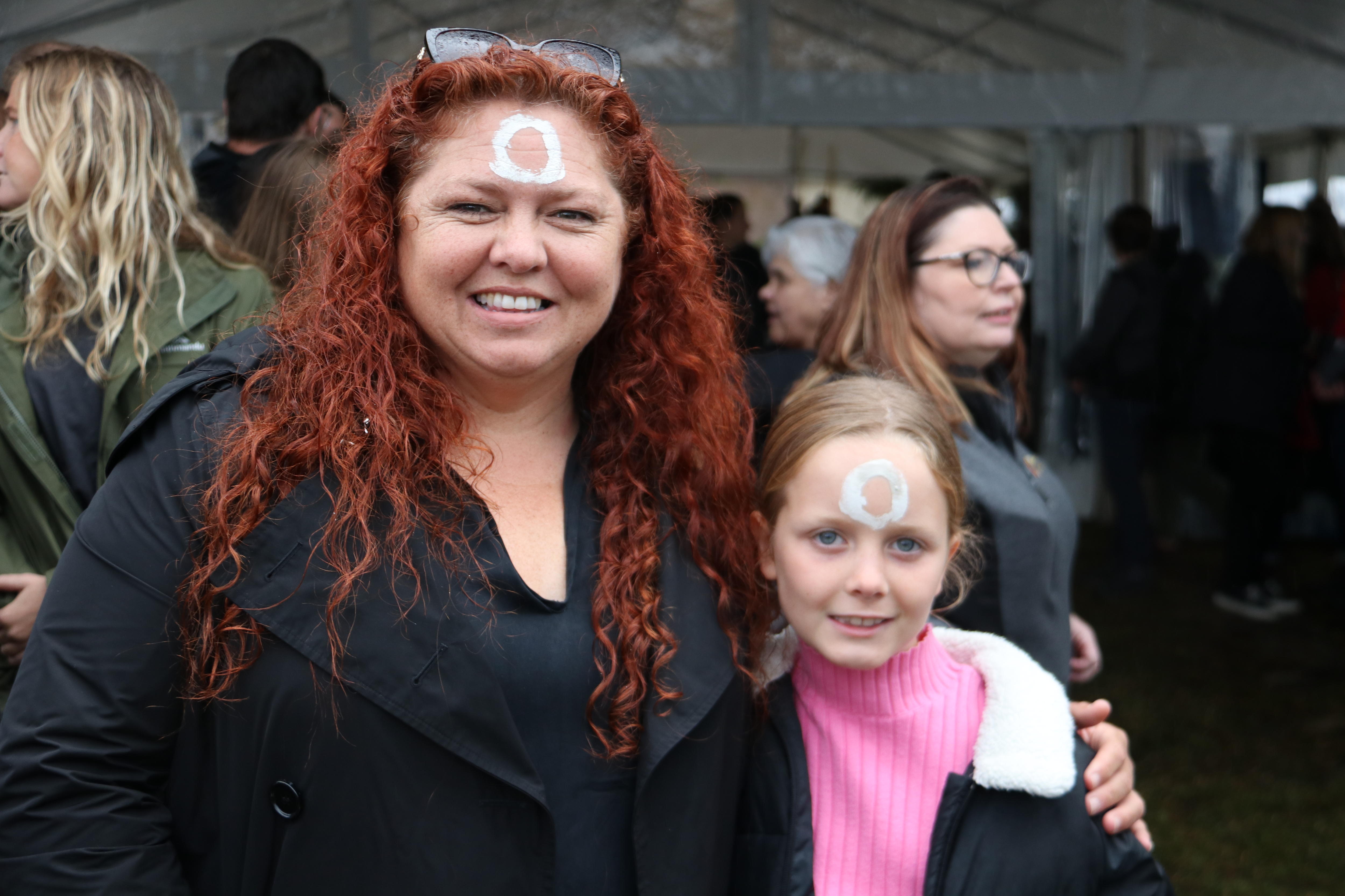 Eastern Maar citizen Jodie Sizer and her daughter Chloe travelled from Torquay and were painted up with the symbol for "woman".