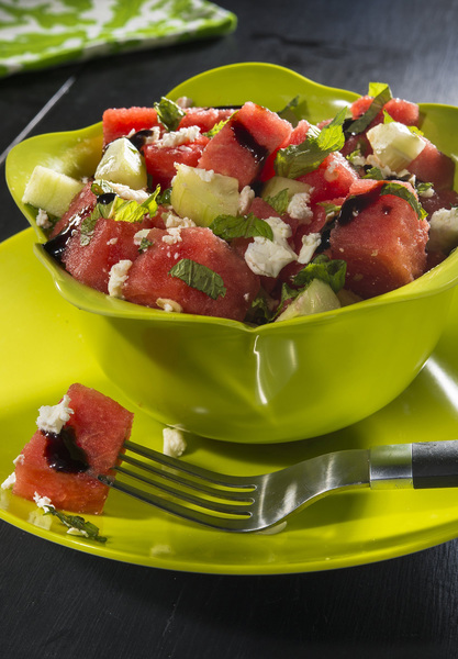 This refreshing summer salad uses a sprinkling of feta to bring out the sweetness in the cool watermelon. The balsamic vinegar glaze, which you can buy or make, layers on another salty-sweet component that adds a richness and elegance to the salad.