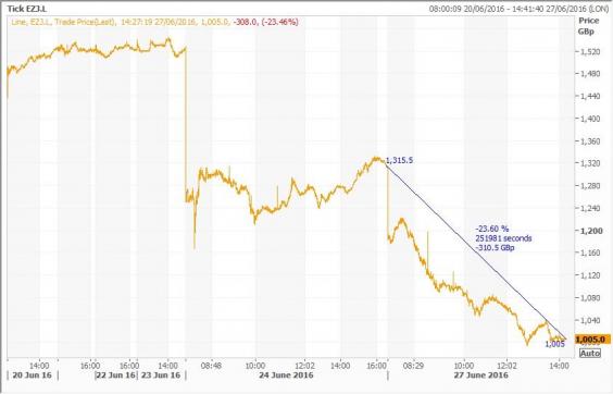 EasyJet was one of the biggest losers on the FTSE 100 shortly after midday with shares down more than 23 per cent to 1,005p.