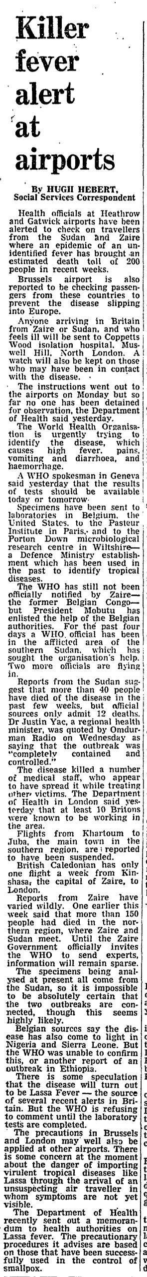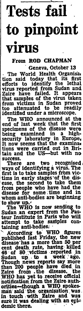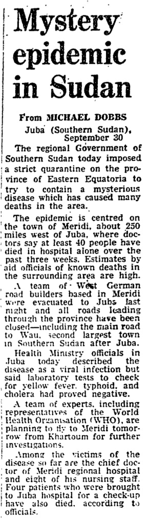 Reports of a ‘mystery epidemic’ in Sudan that was causing many deaths began to appear on the pages of the Guardian from 1 October 1976.