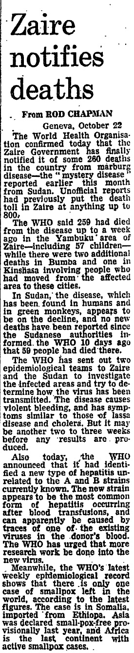 By 23 October unofficial reports were putting the death toll in Zaire at anything up to 800. WHO announced that it had identified a new type of hepatitis unrelated to the A and B strains currently known.