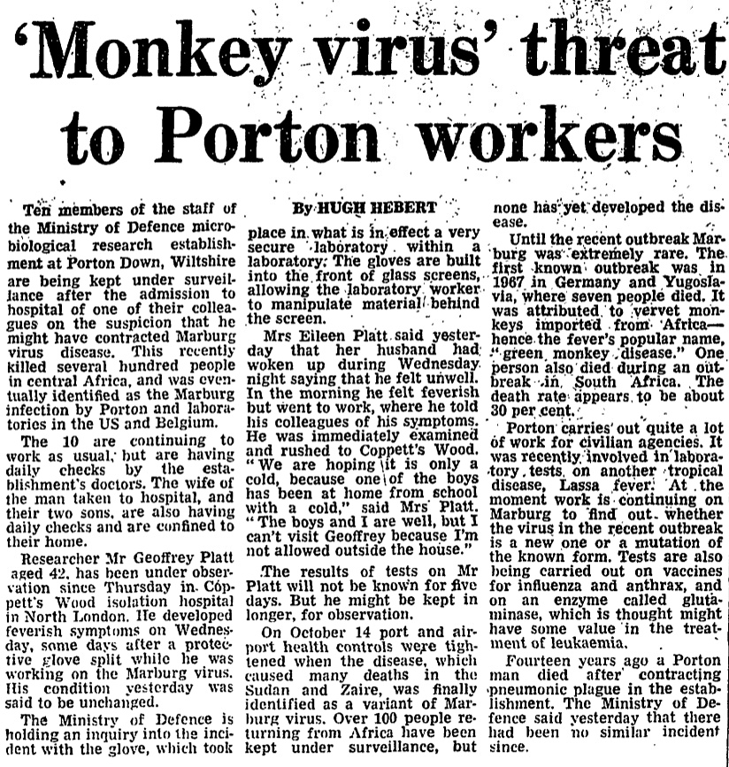 However, in mid-November there was a fear that workers at the Ministry of Defence biological research establishment at Porton Down may have contracted the disease.