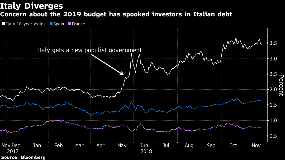 While the country’s bonds have risen this week, 10-year yields are still far higher than at the start of the year. In addition to investor pressure, the European Commission has rejected the budget of the populist government.