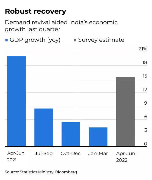 Gross domestic product (GDP) is estimated to rise 15.4% in the three months to June from a year ago, according to a Bloomberg survey of economists. That’s the fastest reading since the April-June quarter of 2021 and compares with a 4.09% expansion in the previous three months.