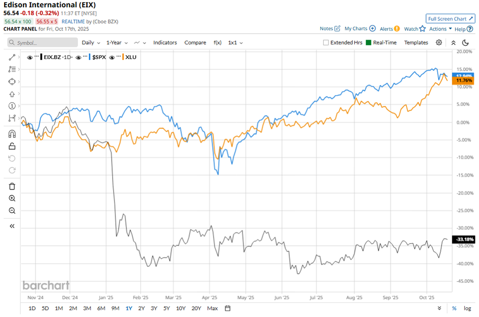 EIX stock has dropped 33.4% over the past 52 weeks, lagging behind both the S&P 500 Index's ($SPX) 13.3% gain and the Utilities Select Sector SPDR Fund's (XLU) 12.2% increase over the same period.