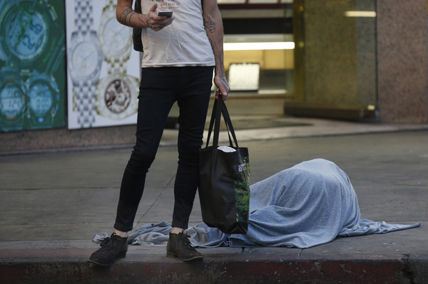 As homelessness spreads across Los Angeles County _ the official tally shows a 46 percent increase from 2013 to 2017 _ it is drawing two conflicting responses, at times from the same people. There's sympathy and a desire to help, but there's also a sense of being invaded and perhaps even endangered _ in terms of both physical safety and public health (see, for example, the state of emergency California declared last year over a hepatitis A outbreak that spread among the homeless, or the Skirball blaze that was sparked by a cooking fire in a homeless encampment). There's an unavoidable, often unspoken, fear that the city around us may be in a state of irreversible decline, and a suspicion on the part of some that the rights of homeless people have trumped the rights of everyone else.