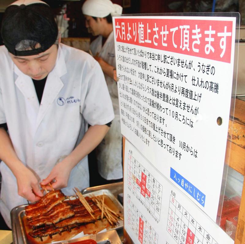 The trade price of adult eel is about 50 percent higher than the previous year, and eel-specialty restaurants are already moving to raise prices. Prices of eel dishes are likely to be extremely high this summer.