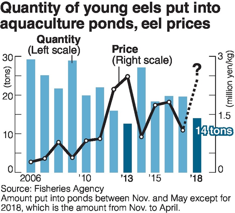 According to the Fisheries Agency, catches of glass eel, or young Japanese eel, have been low this season, causing a decline in the volume of glass eels that are put into domestic aquaculture ponds. In the fishing season between November last year and April this year the catch was only 14 tons, making it likely to be the second-lowest on record.