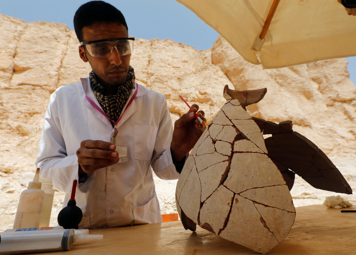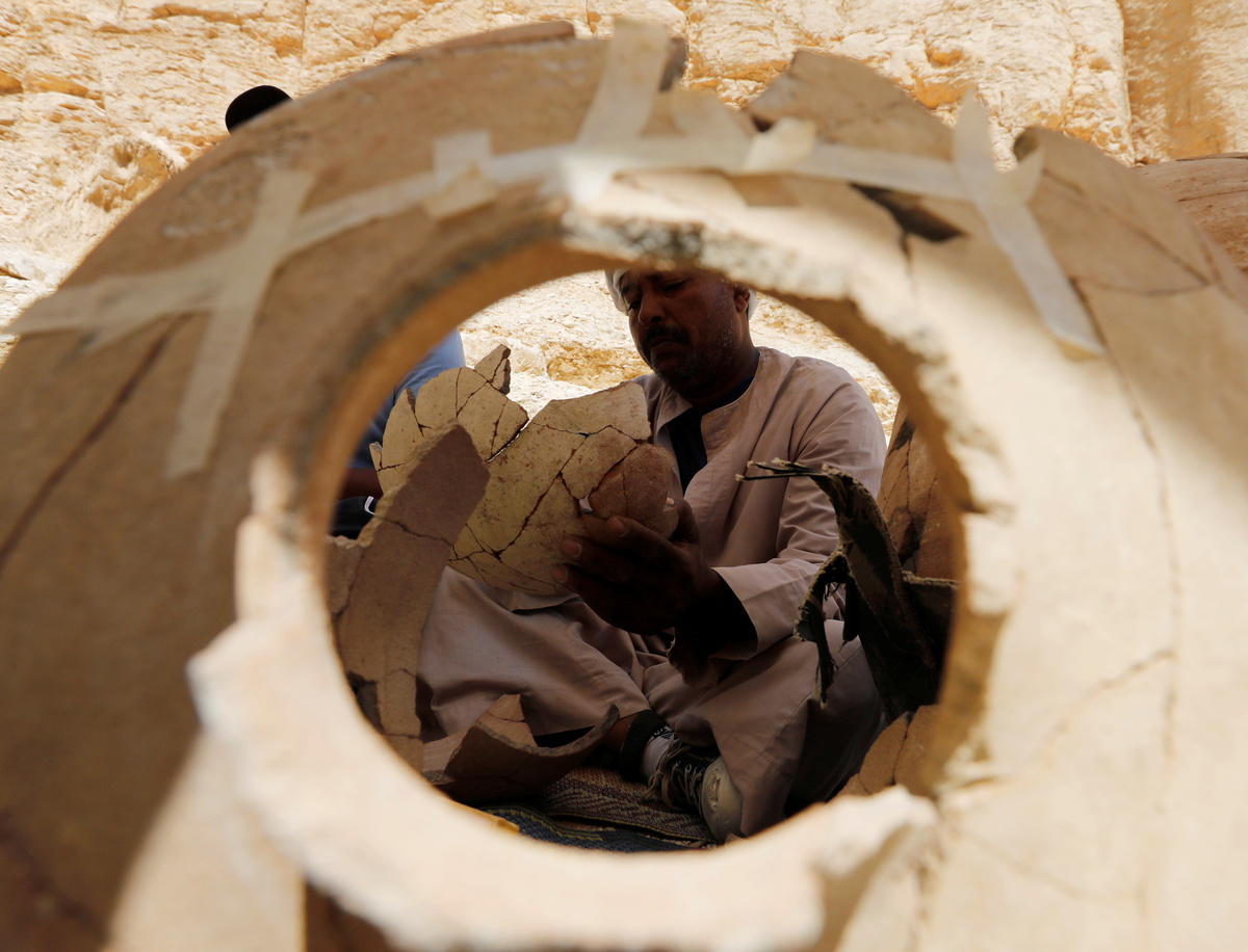 Egyptians archaeologists work on objects discovered through an archaeological mission in the Monkey Valley near the Valley of the Kings in Luxor, Egypt October 10, 2019. REUTERS/Mohamed Abd El Ghany